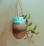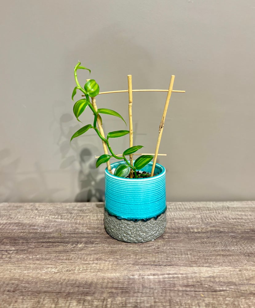 Vanilla planifolia in turquoise ceramic, 120mm. Climbs with quiet intent. Scented blooms if you’re lucky.