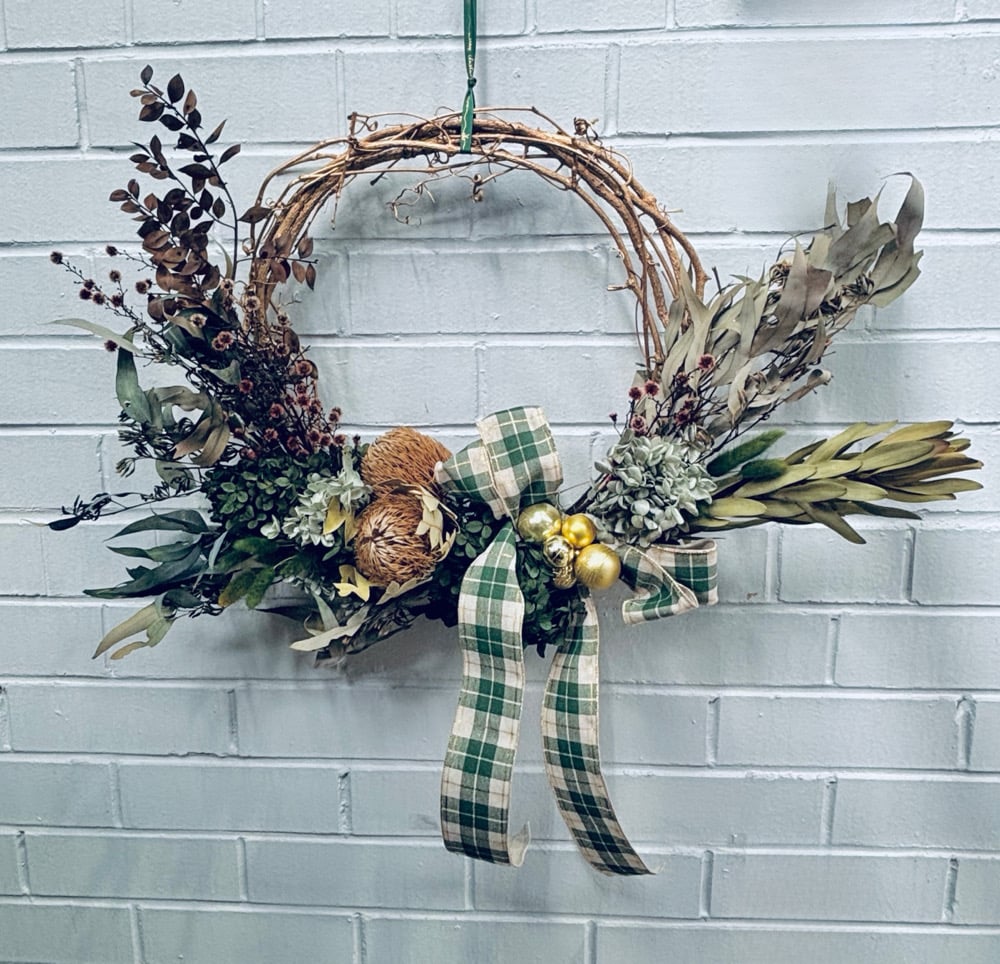 A large wreath of native greens and subtle Aussie accents. Hung on the door, it nods to the bush in summer’s glare.